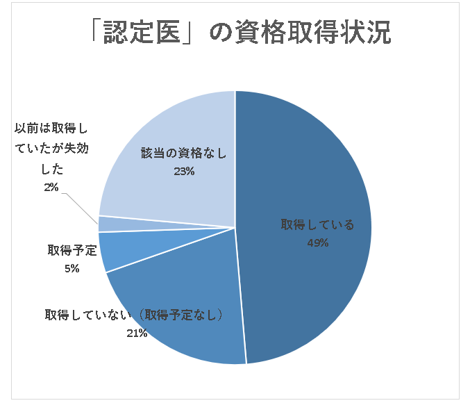 「認定医」を取得している医師は49%という状況です。専門医と比べると「該当の資格なし」(23%)と回答する割合も多くなっています。
