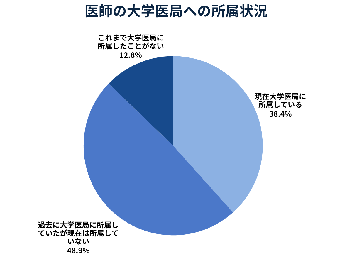 最も多いのは「過去に大学医局に所属していたが現在は所属していない」医師で48.9%となっており、「現在大学医局に所属している」医師は38.4%と4割弱になっています。また、「これまで大学医局に所属したことがない」医師も12.8%という状況です。