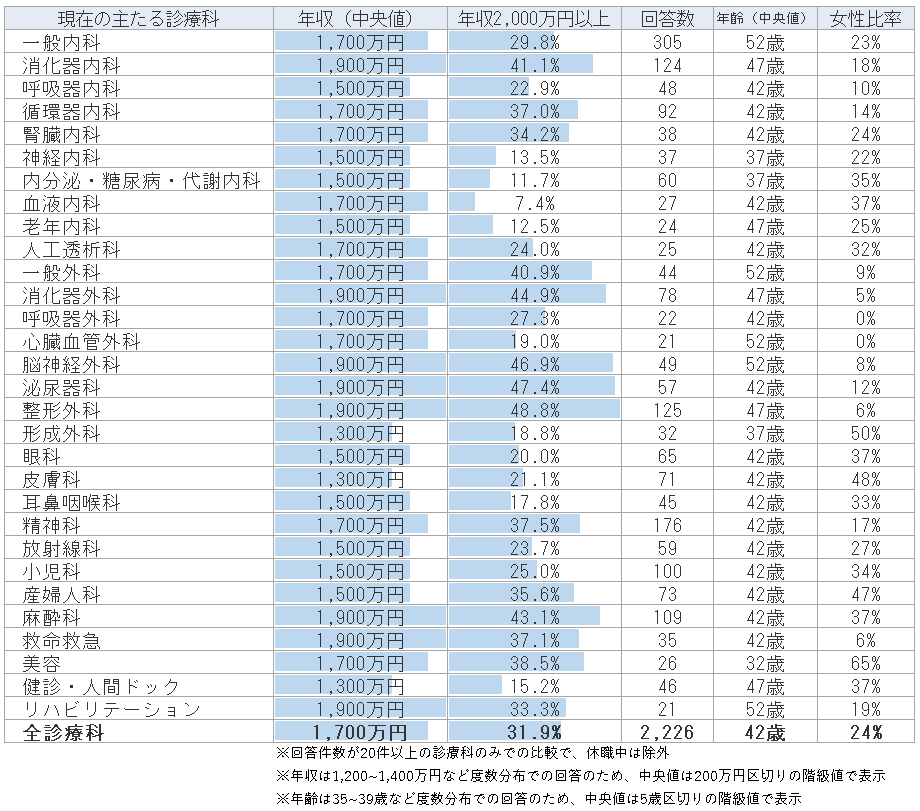 医師の診療科別での年収の中央値(アルバイト・副業含む)と、年収2,000万円以上の割合をまとめたのが下表になっています。なお、調査した年収データは「1,400~1,600万円」など度数分布のデータとなっているため、200万円区切りの階級値での表示となっています(年齢についても同様)。