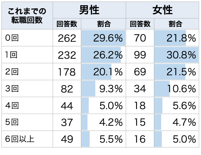 ただし、若い年代の医師は転職回数が少ない傾向にあるため、女性医師の年齢層が男性医師よりも高世代に偏っていた場合、性別よりも年代別の傾向が影響している可能性もあります。