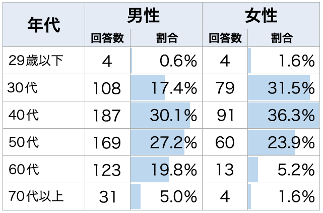 また、医師の転職回数についてのアンケート結果を年代別や男女別に見た傾向についてもお伝えします(回答者の属性)。