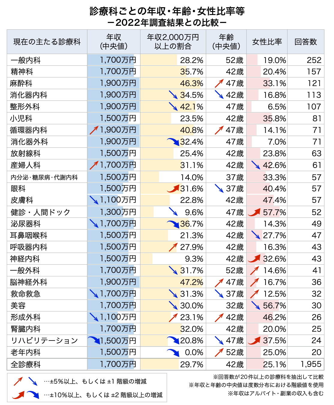 診療科ごとの年収(アルバイト・副業込み)・年齢・女性比率の変化