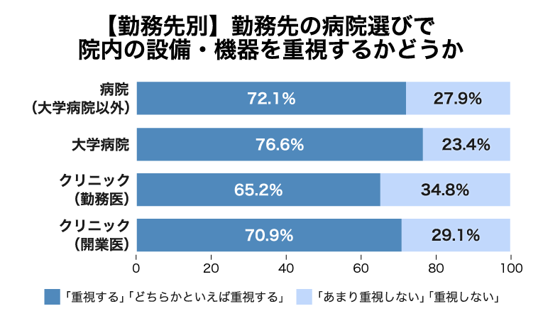全体的に重視する割合が低かった条件ですが、29歳以下と30代、また大学病院勤務医においては、他と比べて重視している医師の割合がやや高い傾向が見られました。